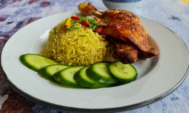 Nasi Kebuli is a fragrant rice dish made with coconut oil and chicken (sometimes substituted with lamb or mutton), raisins, olives, clovers, olives, and lemongrass.