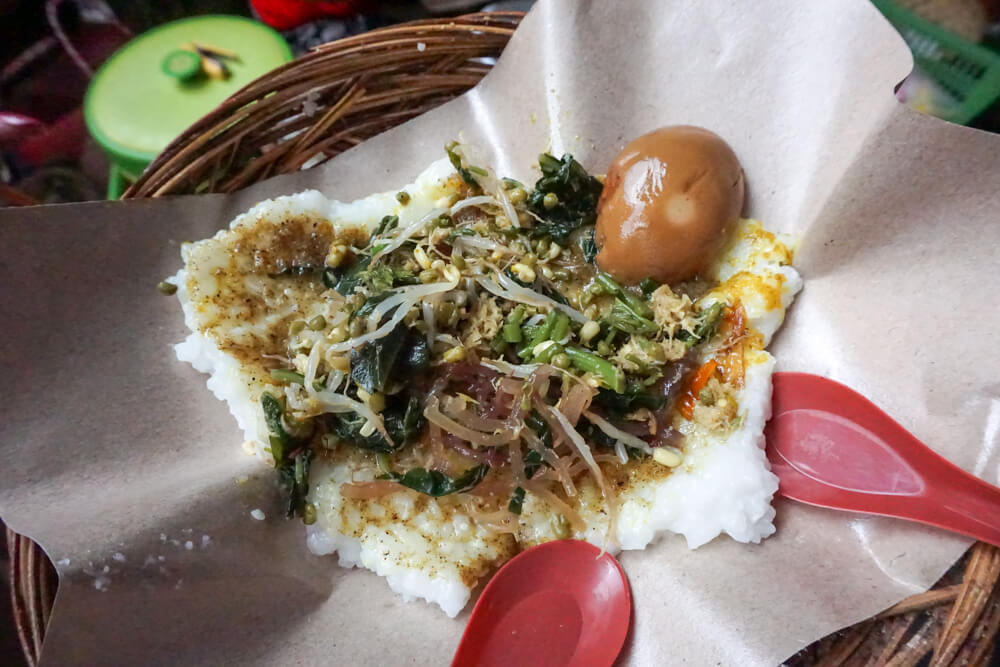 Imagine a complete meal — rice, side dish, vegetables, and condiments — wrapped in a banana leaf: that is Nasi Jinggo. Tourists can find Nasi Jinggo on almost every main street in Bali, sold from food street kiosks or from parked motorcycles, with side dishes ranging from fish, beef, and chicken to seafood and eggs.